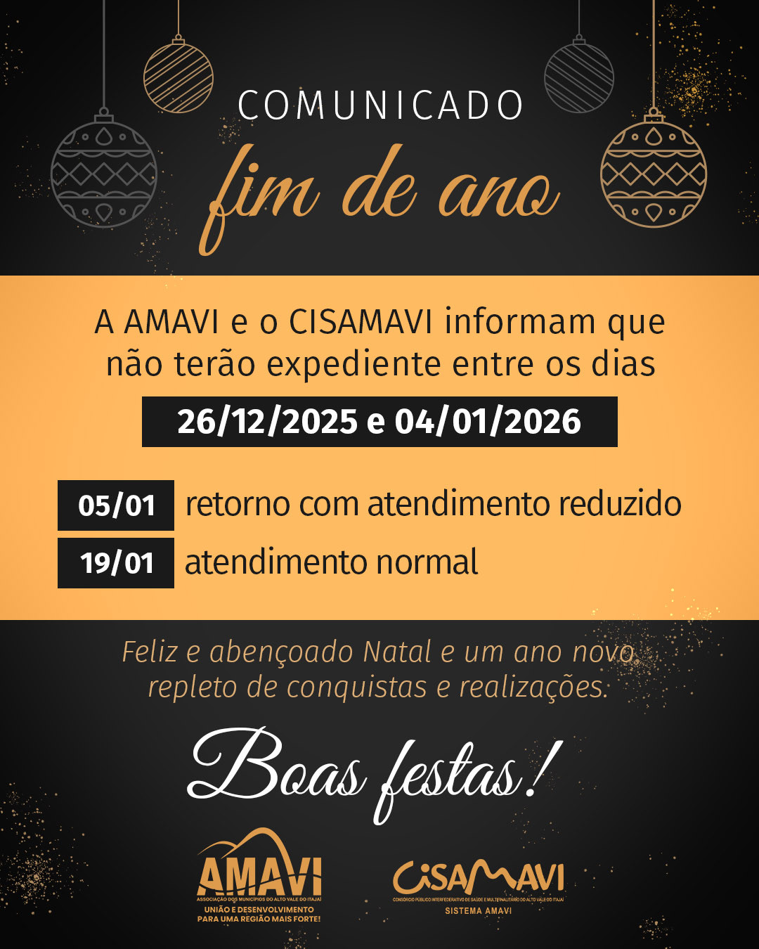 A Associação dos Municípios do Alto Vale do Itajaí (AMAVI) informa que não haverá expediente entre os dias 26 de dezembro de 2025 e 04 de janeiro de 2026.