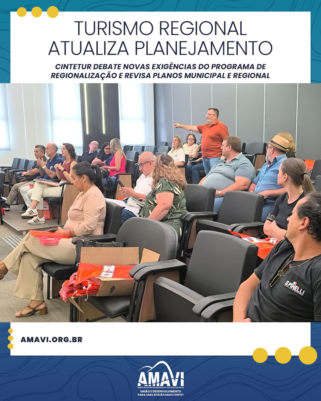 O Programa de Regionalização do Turismo e a atualização dos planos municipais e regional de turismo estiveram no centro dos debates da reunião do CINTETUR (Comitê de Integração da Instância de Governança Regional Caminhos do Alto Vale e do Turismo), realizada nesta terça-feira (04), no auditório da AMAVI.