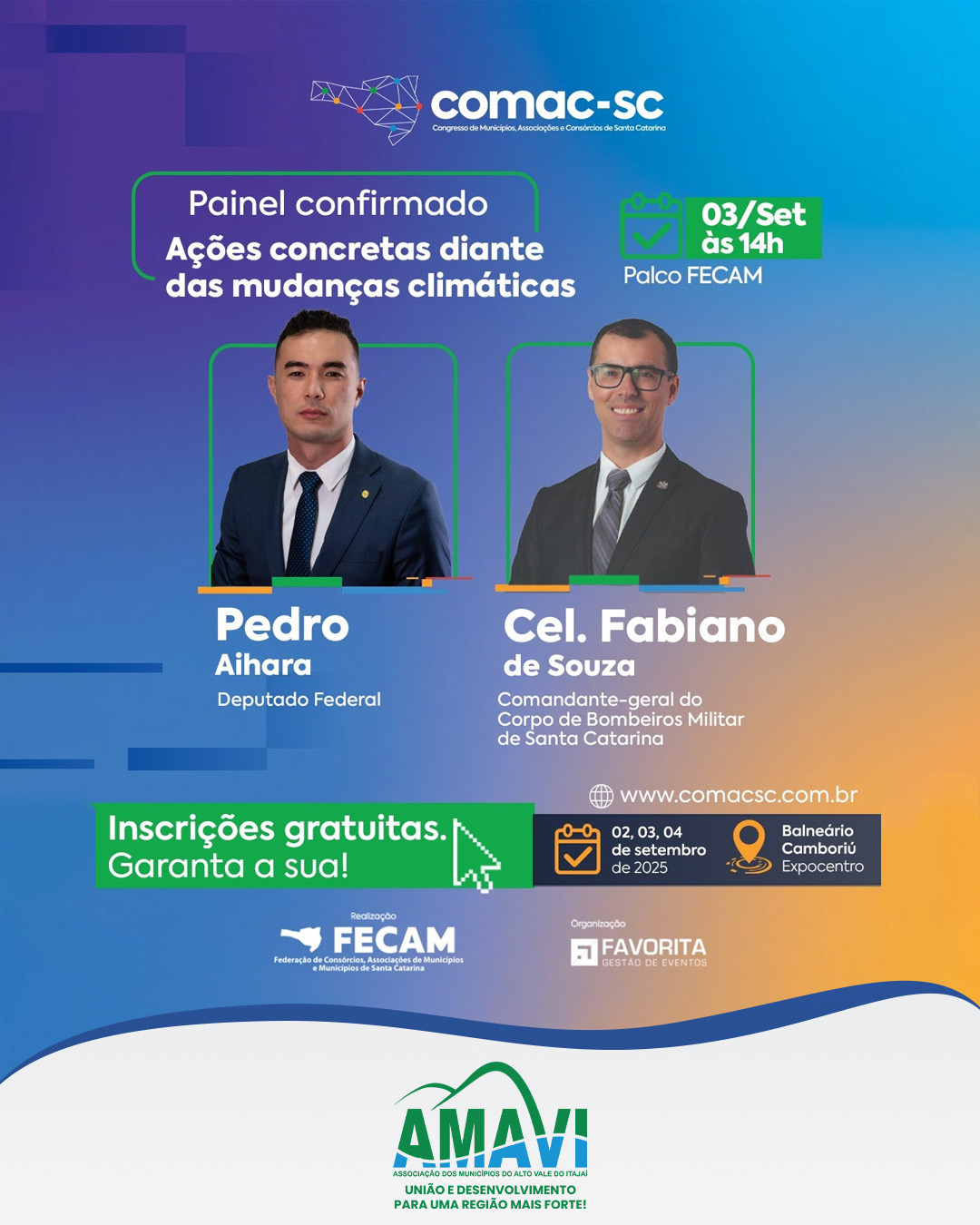 O presidente da AMAVI, prefeito Manoel Arisoli Pereira, foi o mediador do painel "Ações concretas diante das mudanças climáticas" realizado durante o COMAC 2025. O evento organizado pela FECAM reuniu gestores públicos, técnicos e especialistas de todo Estado para discutir entre outros temas, a inovação na administração pública, o fortalecimento dos consórcios e o papel das associações regionais.