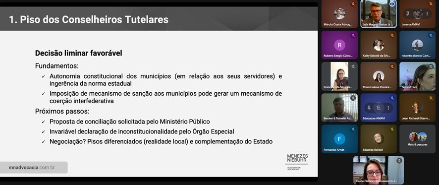 Ainda durante o encontro os representantes dos municípios acompanharam a explanação do Dr. Luiz Magno Pinto Bastos Júnior, Consultor da Fecam sobre o Piso do Magistério e o Piso dos Conselheiros Tutelares. Em pauta ainda esteve uma conversa com Marcia Zilá Longen que tratou sobre a Reforma Tributária e os principais impactos para os municípios.